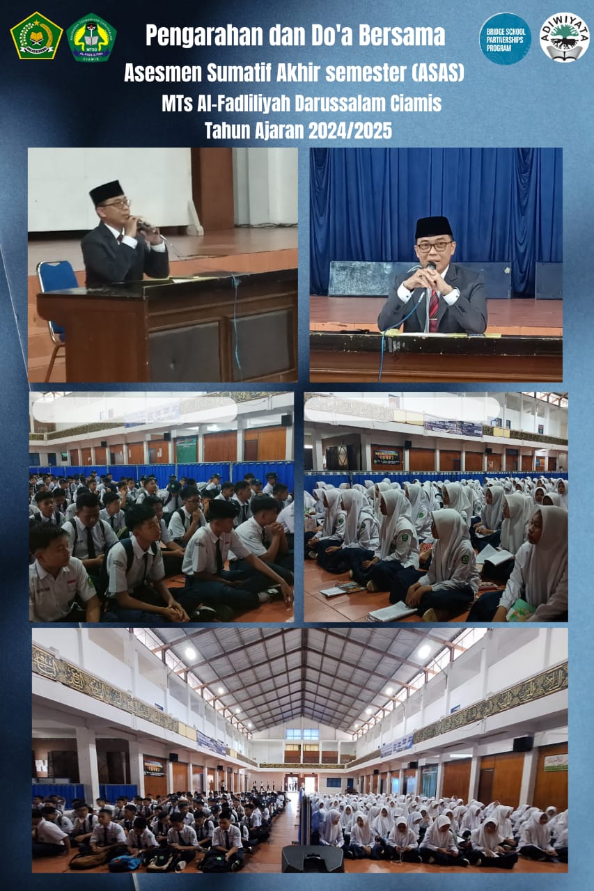 MTs Al-Fadliliyah Darussalam Ciamis melaksanakan Asesmen Sumatif Akhir Semester (ASAS) Ganjil Tahun Ajaran 2024/2025 pada 02–12 Desember 2024. Kegiatan ini diikuti oleh seluruh siswa kelas VII, VIII, dan IX, diawali dengan doa bersama serta pengarahan dari Kepala Madrasah, Dr. H. Fadlil Yani Ainusyamsi, M.Ag.